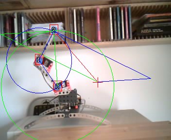 The main problem in the last version was keeping track of my blue points. The initialization code I had in phases 1 and 2 is no longer needed now. Instead I added 2 extra blue points. This gives me more information about the structure of the arm, and allows me to identify the points using only a single frame. |